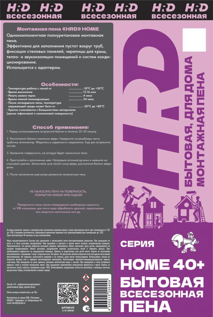 Монтажная пена HDR HOME — однокомпонентная полиуретановая пена с выходом до 40 л, разработанная для бытового применения с адаптером. Подходит для заполнения пустот вокруг труб, фиксации стеновых панелей и кровельной черепицы, а также для тепло- и звукоизоляции помещений и систем кондиционирования. Обладает хорошей адгезией к большинству строительных материалов, рабочая температура применения от –10 °С до +30 °С, время высыхания 12–16 минут, полная полимеризация — 24 часа. После затвердевания сохраняет стабильность при температуре от –30 °С до +80 °С.